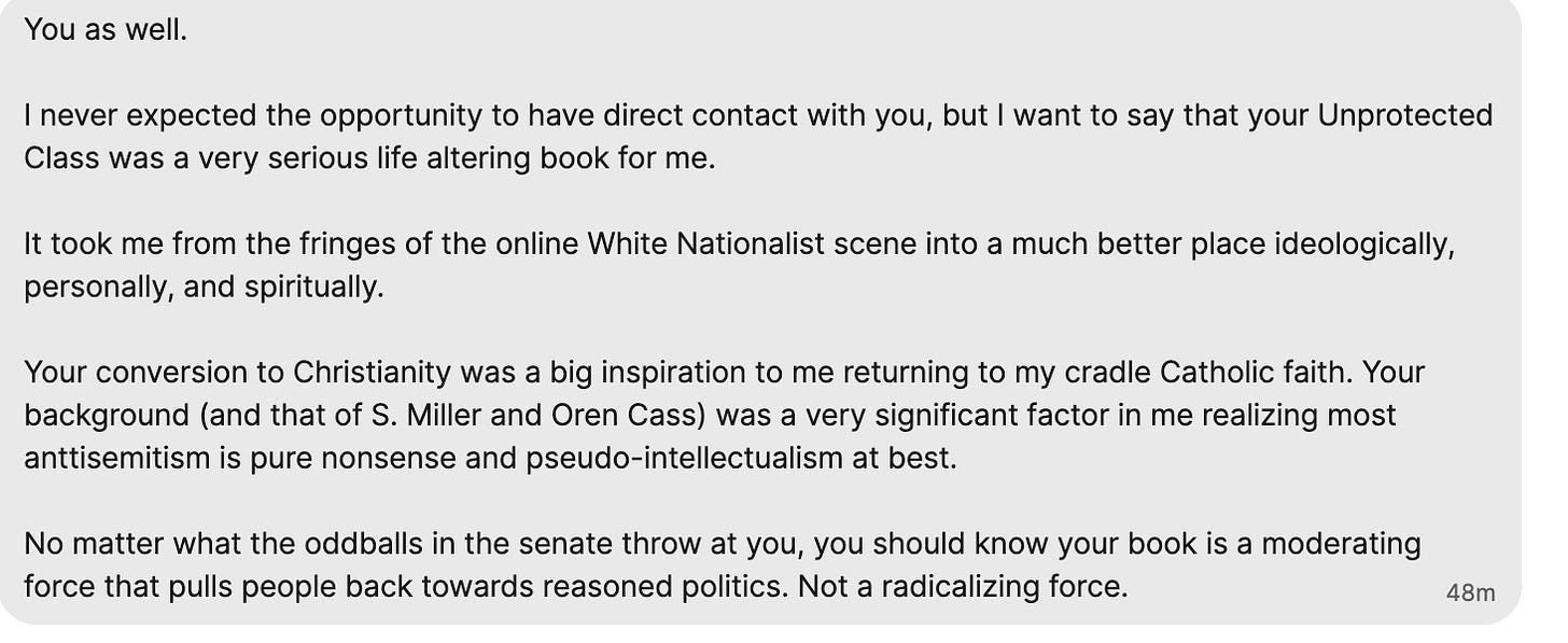 This was someone who, by his own description, had once been on the fringes of the online White nationalist right. He told me that The Unprotected Class was a “life altering” book for him that led him back to Christianity, away from political radicalization, and “towards reasoned politics.” While his note was particularly kind and flattering, especially coming from someone who was having a major effect on the current discourse, I had heard similar stories about my work from many others.
